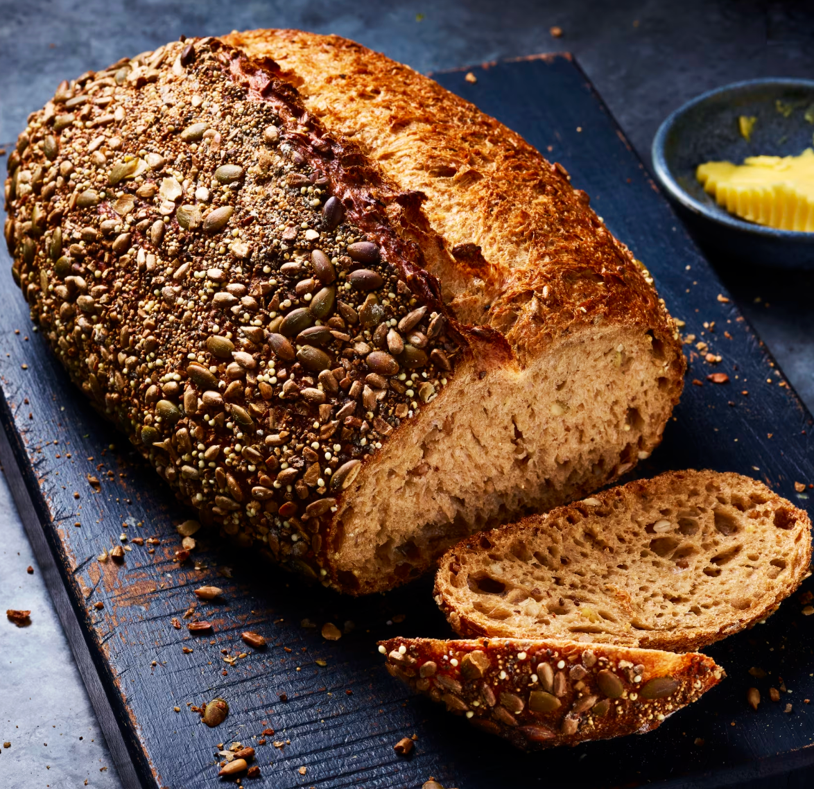 Contains 10% wholewheat flour, topped with linseeds, oats & pepitas